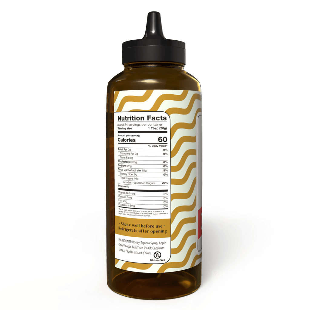 Ingredients: Honey, Tapioca Syrup, Apple Cider Vinegar, less Than 2% Capsicum Extract, Paprika Extract (color)