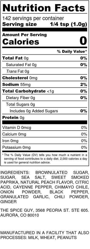 Ingredients: Brownulated Sugar, Salt, Sweet Smoked Paprika, Natural Peach Powder, Citric Acid, Cayenne Pepper, Chile Powder, Onion Powder, Black Pepper, Granulated Garlic, Chili Powder, Ginger