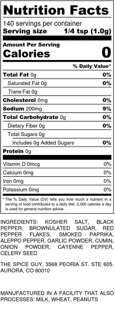 Ingredients: Kosher Salt, Spice, Brownulated Sugar, Smoked Paprika, Aleppo Pepper, Garlic Powder, Onion Powder, Cayenne Pepper, Natural Hickory Smoke Powder