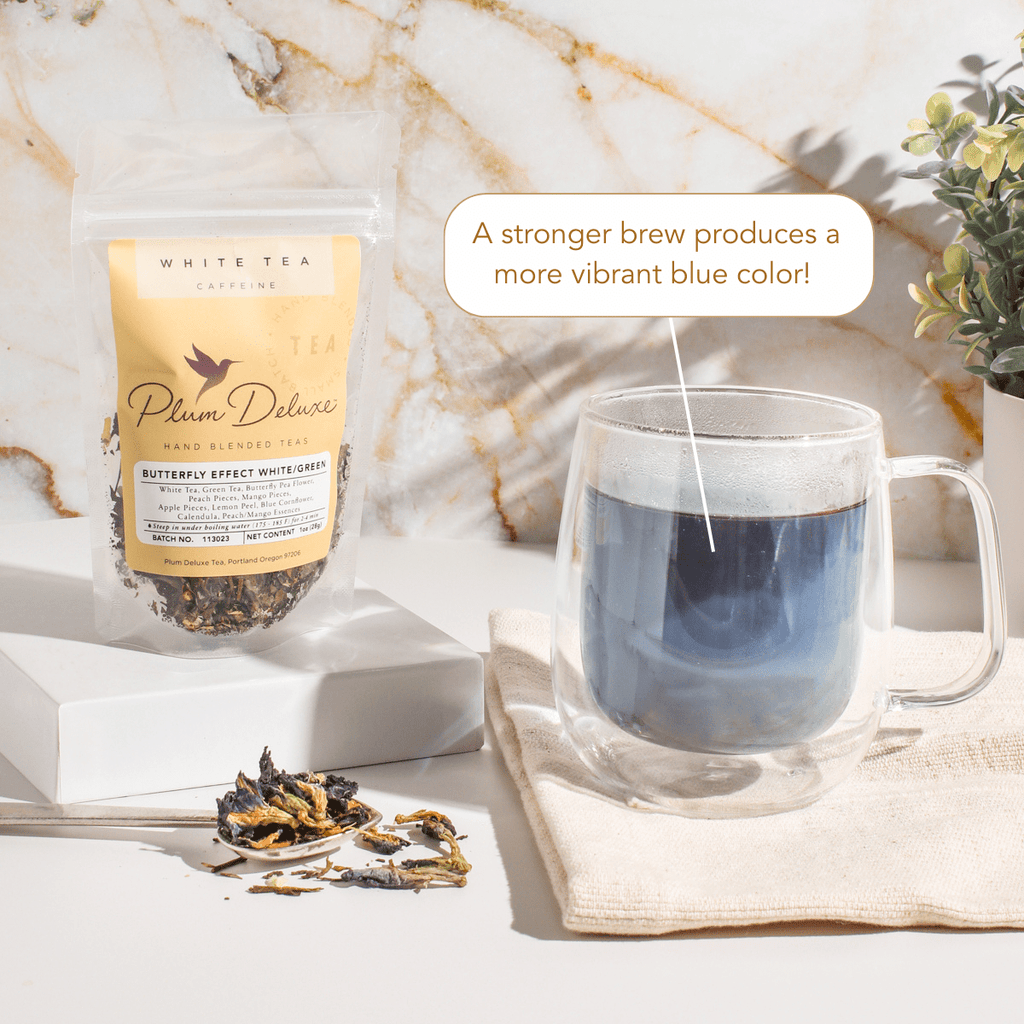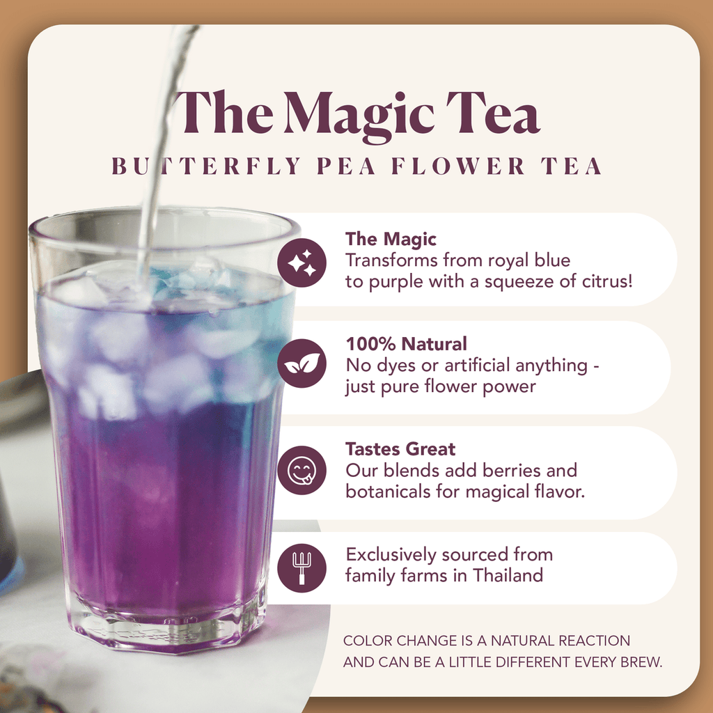 Experience the classic butterfly pea flower tea in a new and fun way with a mélange of green and white teas and juicy fruit pieces. You won't believe the color! Perfect for those moments when you want to feel inspired.