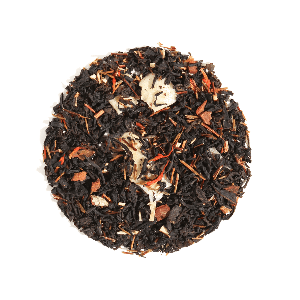 Ingredients: Black Tea, Green Rooibos, Coconut Pieces, Cinnamon Chips, Vanilla/Pecan/Coconut/Caramel/Walnut Essences, Orange Blossom, Safflower.