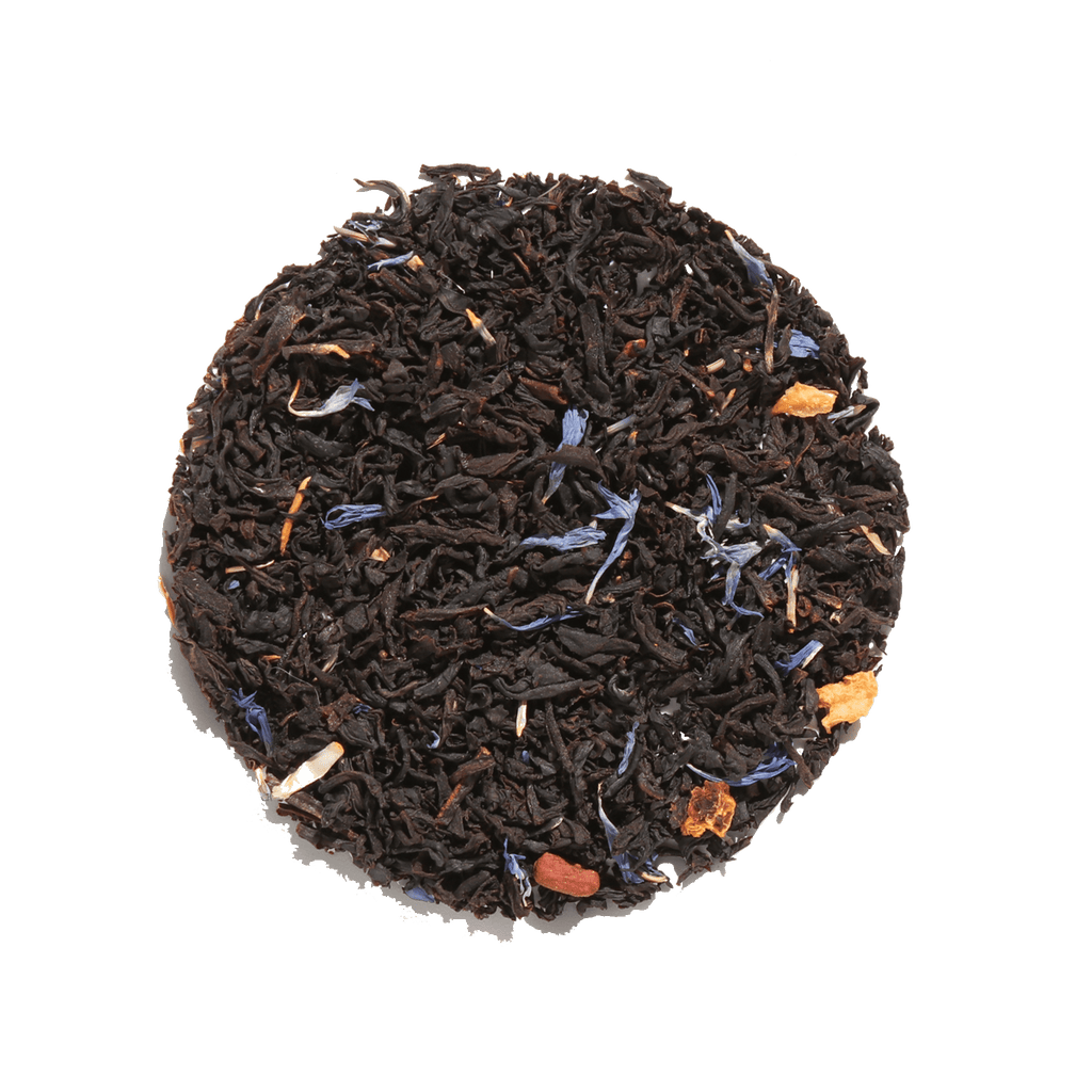 Ingredients: Black Tea, Orange Peels, Blue Cornflowers, Cinnamon Chips, Bergamot Oil, Pecan Essence.